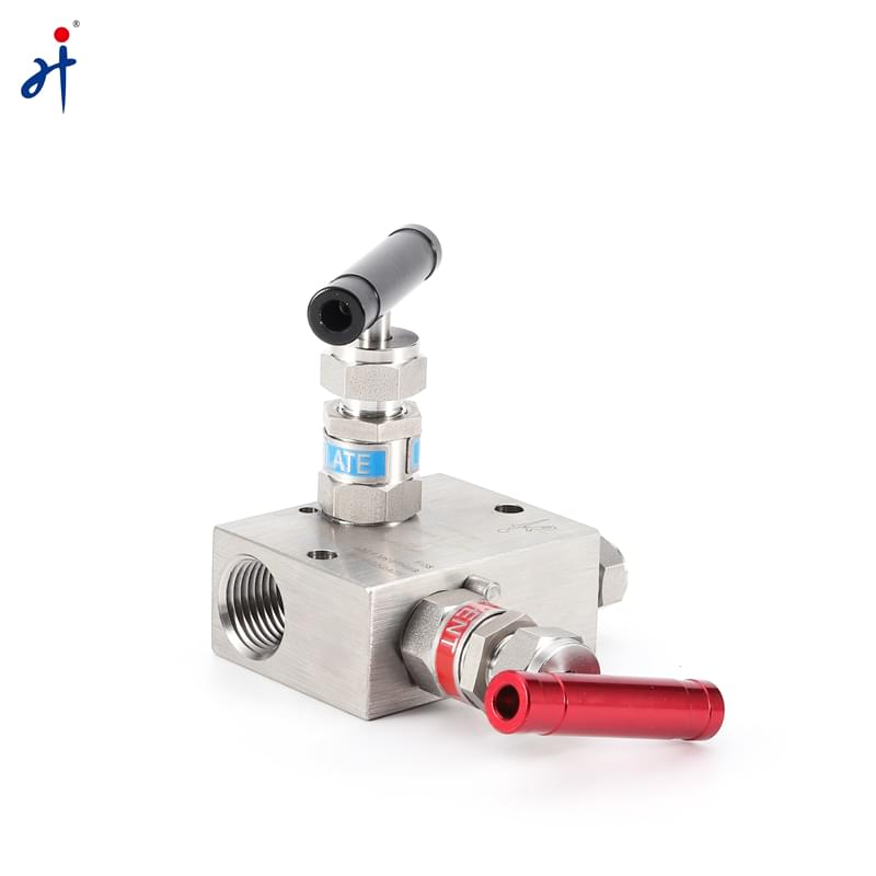 Elbow Type Two Valve Manifold made by Anhui Hongji (Valvento). Combine several valves in one body with multiple connections. This equipment assists pressure instruments such as pressure gauges, pressure transmitters, and differential pressure transmitters directly and indirectly in measuring and equalizing pressures, differential pressures, static, gauge, and variable in process instrumentation lines by bleeding, blocking, and calibrating.