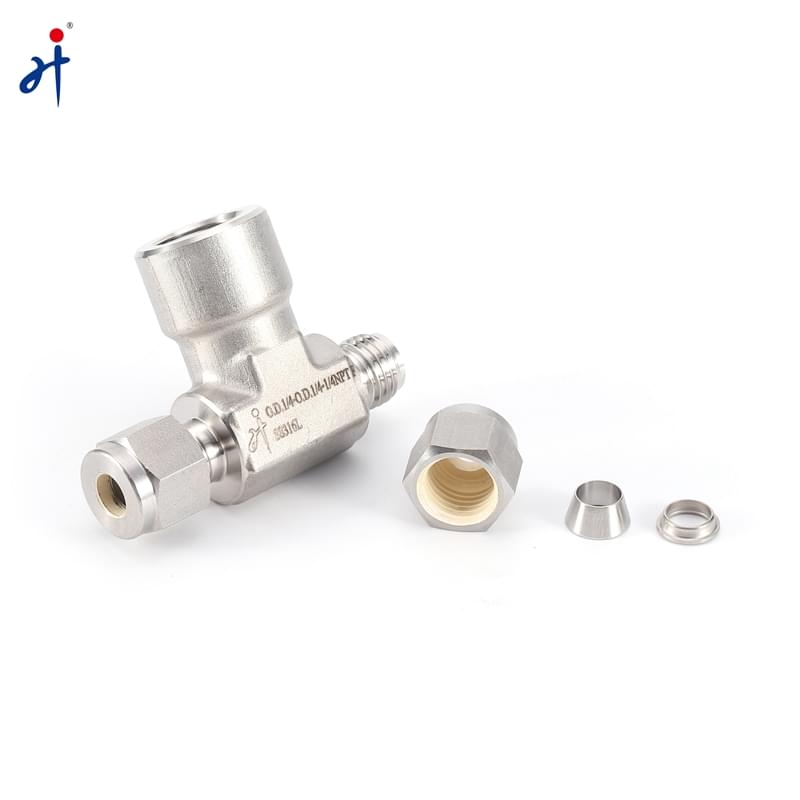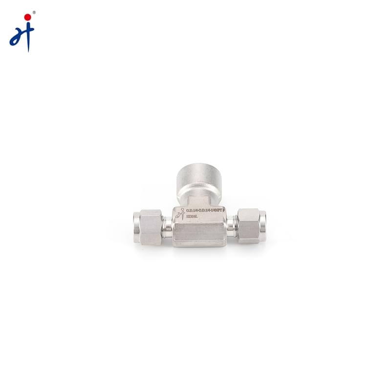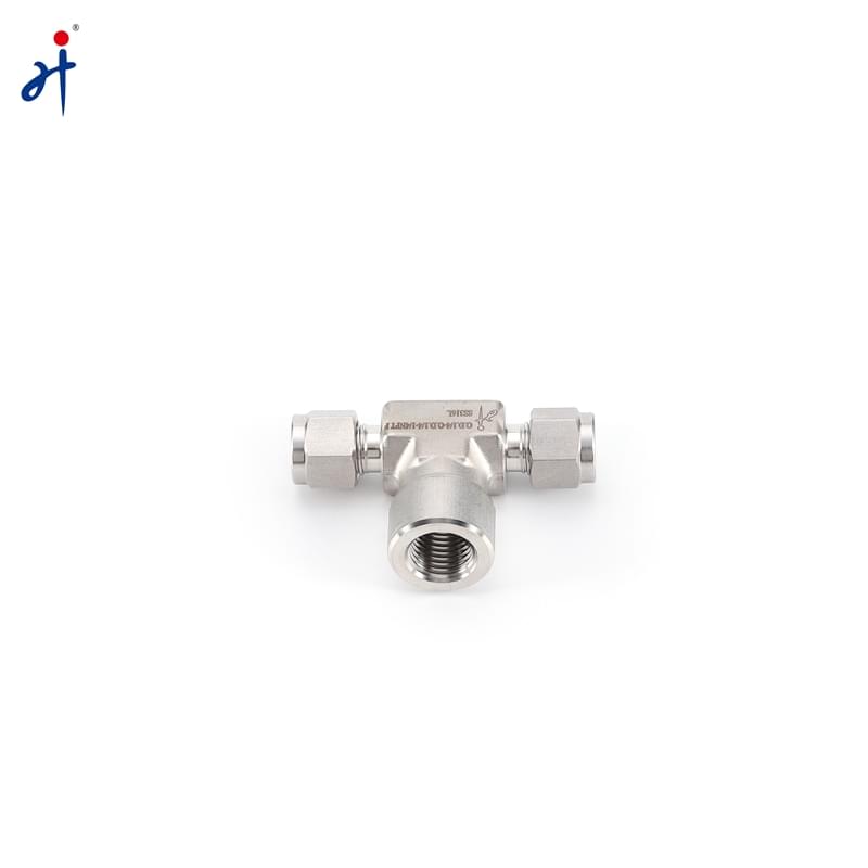 Anhui Hongji (Valvento) Female Branch Tees used to connect three pipes together. It features compression fittings on two ends and a possible threaded connection in the middle, often utilized in fluid, gas, or other media systems for distribution or convergence. Known for its corrosion resistance and high strength, this type of fitting is commonly applied in industries like petroleum, chemical, and gas transport, as well as in laboratory setups.