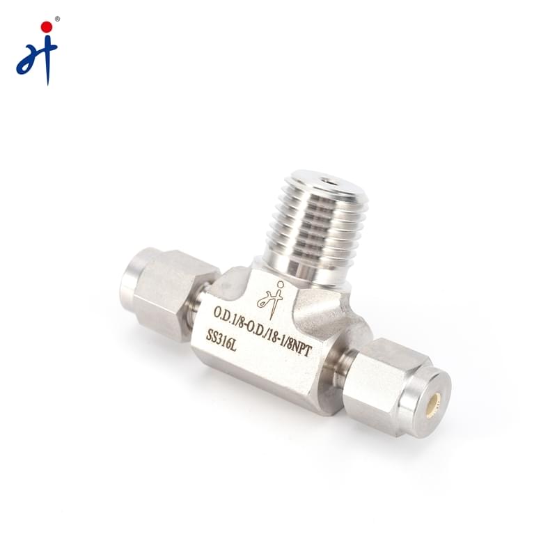 Tee-Type Male Tube Fitting used to connect three pipes together. It features compression fittings on two ends and a possible threaded connection in the middle, often utilized in fluid, gas, or other media systems for distribution or convergence. Known for its corrosion resistance and high strength, this type of fitting is commonly applied in industries like petroleum, chemical, and gas transport, as well as in laboratory setups.